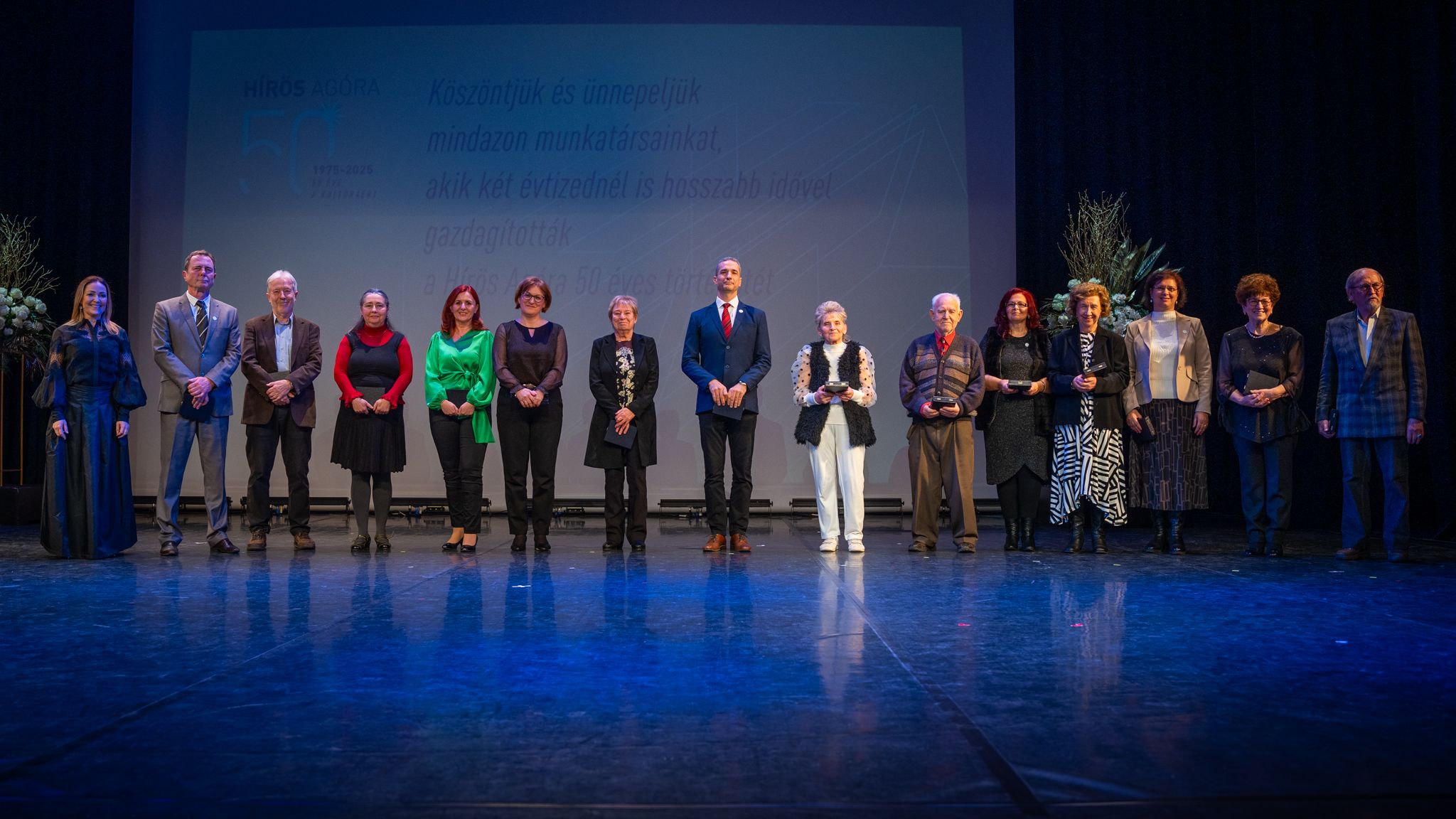 HA50 Gálán elismerésben részesítettük azokat a kollégákat, akik több mint 20 éven át dolgoztak az intézményben, köztük olyanokat is, akik ma már nyugdíjasként viszik tovább a Hírös Agóra emlékeit és szellemiségét. Kitartásuk, szakmai megbízhatóságuk és közösségformáló jelenlétük a Hírös Agóra történetének része: